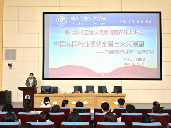 为进一步深化产教融合、促进校企合作,现代农林工程学院于12月25日成功举办第四期赣州职院农林大讲堂。本期大讲堂特邀苏州花园集教育科技有限公司创始人、国家注册园林工程师郑既枫先生,为园林专业师生带来了题为《中国花园行业现状全景与未来展望——开启花园艺术与职业新征程》的精彩讲座。讲座由现代农林工程学院负责人巫健主持,园林技术专业、园林工程技术专业在校生及园林教研室全体教师参加。