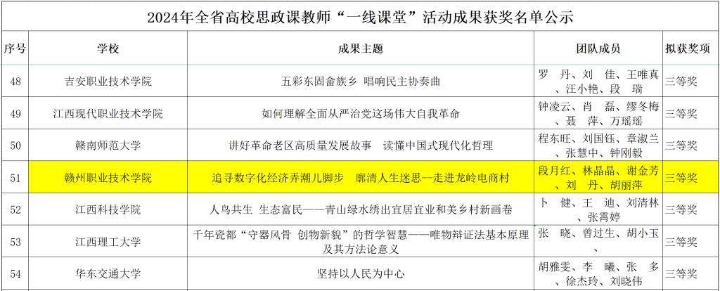 近日,江西省教育厅发布全省高校思想政治课教师“一线课堂”优秀成果评选结果公示,德赢官网推荐的《思想道德与法治》一线课堂成果“追寻数字化经济弄潮儿脚步廓清人生迷思--走进龙岭电商村”荣获省三等奖。
