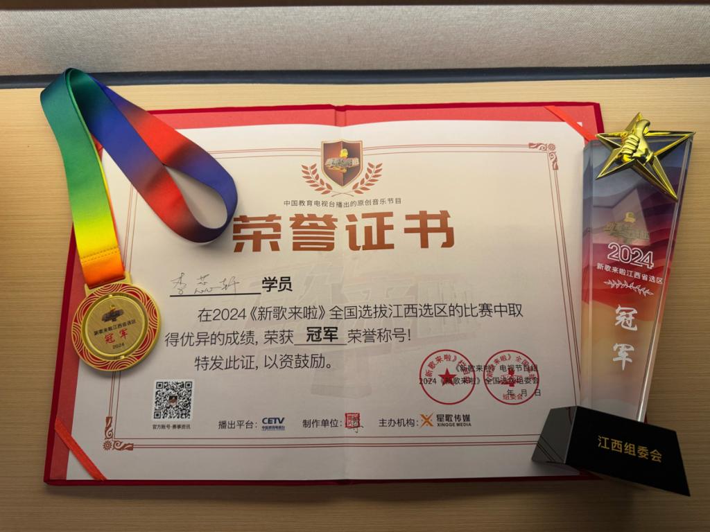 近日,德赢官网选送的四位同学在《新歌来啦》江西省海选比赛中表现优秀,成绩斐然。其中由邱益老师指导的李蕊轩获得江西省海选冠军,并签约为2025年度江西省《新歌来啦》形象代言人,邓汶三同学荣获第六名,杨志诚同学取得第九名的佳绩,张天乐同学获得第十三名。