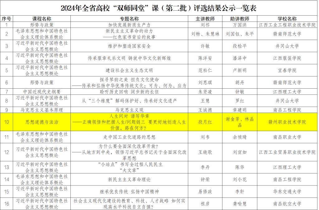 近日,江西省教育厅发布2024年全省“大思政课”建设综合改革试验区改革项目评选结果公示,德赢官网推荐的《思想道德与法治》优秀成果“人生问对谱写华章——正确领悟和把握人生”成功入选2024年全省高校“双师同堂”课(第二批)。