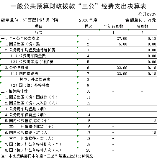 十六、“三公”经费:指各部门因公出国(境)费、公务用车购置及运行费和公务接待费。其中,因公出国(境)费指单位公务出国(境)的住宿费、旅费、伙食补助费、杂费、培训费等支出;公务用车购置及运行费指单位公务用车购置费及租用费、燃料费、维修费、过路过桥费、保险费、安全奖励费用等支出;公务接待费指单位按规定开支的各类公务接待(含外宾接待)支出。