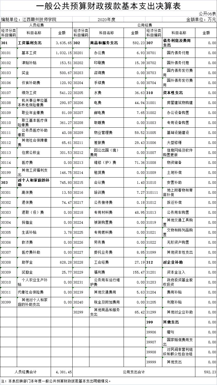 我院2020年度支出总计9729.46万元,其中本年支出合计9729.46万元,较2019年增加1253.77万元,增长14.79%,主要原因是:赣州市综合公共实训基地专项资金支出增加。年末结转和结余1259.58万元,较2019年减少3649.9万元,下降74.34%,主要原因是:我院加快项目推进,加快专项资金支出以及财政收回部分专项资金。