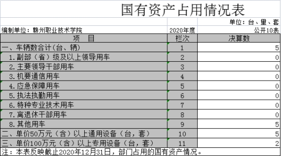 截止2020年12月31日,本部门(单位)国有资产占用情况见公开10表《国有资产占用情况表》。江西赣州赣州技师学院实行公车改革所有车辆均已统一移交,但因固定资产处置手续未办理齐全,暂未下账,实际已无车辆。
