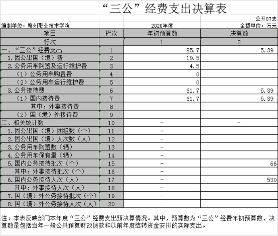 (二)公务接待支出年初预算数为61.7万元。决算数为5.39万元,完成预算的8.73%,决算数较2019年减少5.48万元,主要原因是:第一德赢Vwin官方区域合作伙伴较2019年增加1.07万元,学院为2019年新设立单位,2019年9月才开始正式办学,2019年未发生公务接待费支出。决算数较年初预算数减少的主要原因是年度内严格控制公务接待审核,认真执行公务接待标准。全年国内公务接待20批,累计接待120人次,其中外事接待0批,累计接待0人次。第二,赣州农业学校决算数较2019年减少4.98万元,2020年度内严格控制公务接待审核,认真执行公务接待标准。全年国内公务接待44批,累计接待392人次,其中外事接待0批,累计接待0人次。此外2020年12月份的公务接待费1.09万在2021年列支。第三,江西赣州赣州技师学院较2019年减少1.57万元,由于疫情,线下公务交流活动减少。决算数较年初预算数减少的主要原因是厉行节约,减少公务接待。全年国内公务接待2批,累计接待18人次,无外事接待。