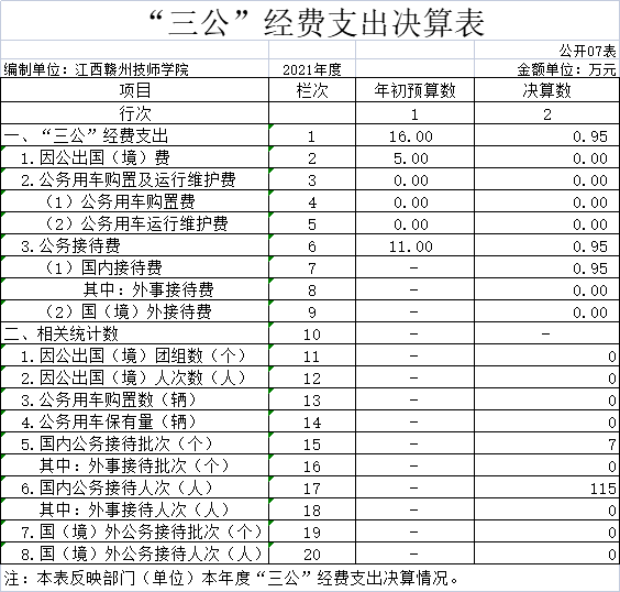 (二)公务接待费支出年初预算数为11万元,决算数为0.95万元,完成预算的8.64%,决算数较2020年增加0.77万元,增长427.78%,主要原因是2020年为疫情期,学院上半年基本采取线上教学模式,无对外公务接待,导致2020年公务接待费较低;2021年全国疫情好转,业务交流增加,导致2021年公务接待费用增加。决算数较年初预算数减少的主要原因是:因疫情管控影响,单位公务业务交流受限,非必要不采取线下交流。全年国内公务接待7批,累计接待115人次,其中外事接待0批,累计接待0人次。