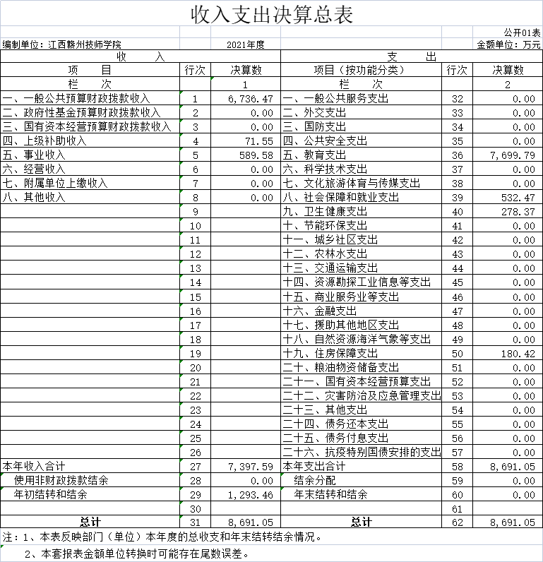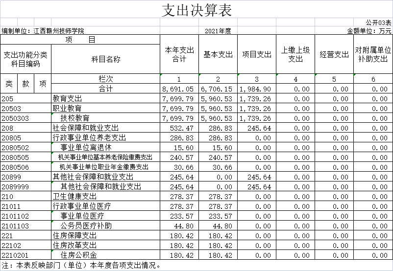 本单位2021年度支出总计8691.05万元,其中本年支出合计8691.05万元,较2020年减少1038.41万元,下降10.67%,主要原因是:赣州市综合型公共实训基地项目接近尾声,本年列支较上年下降;年末结转和结余0万元,较2020年减少1259.58万元,下降100%,主要原因是:本年无结转结余是单位执行财政零基预算政策且我院加快项目推进,加快专项资金支出。