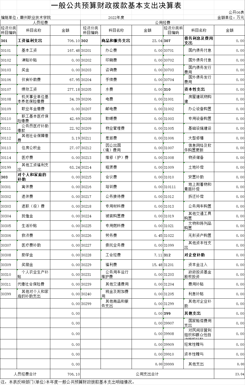 (一)工资福利支出706.1万元,较2021年减少936.57万元,下降57.02%,主要原因是:免学费、生均经费项目补助、学生资助补助和学院运行保障综合定额经费补助这几类项目在2022年列为项目支出,在2021年列为基本支出,我院2022年该项支出大多数用的项目支出而非基本支出。