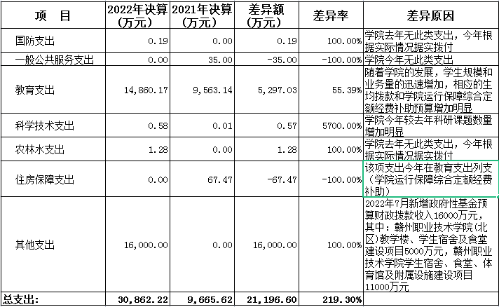本单位2022年度支出总计30862.22万元,其中本年支出合计30862.22万元,较2021年增加21196.60万元,增长219.30%,主要原因如下表;年末结转和结余0万元,与2021年保持一致。