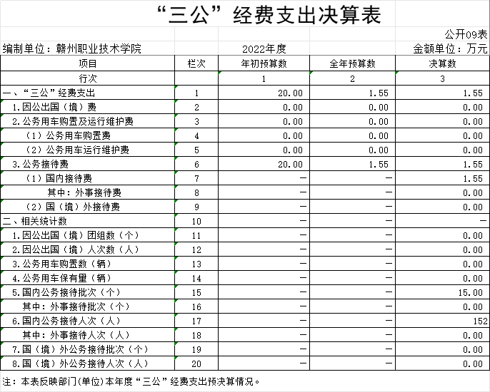 (二)公务接待费支出全年预算数为20万元,决算数为1.55万元,完成全年预算的7.77%,决算数较2021年减少0.9万元,下降36.73%,主要原因是年度内严格控制公务接待审核,认真执行公务接待标准。决算数较全年预算数增加(减少)的主要原因是:年度内严格控制公务接待审核,认真执行公务接待标准。全年国内公务接待15批,累计接待152人次,其中外事接待0批,累计接待0人次,主要为:接待上级部门检查调研及高职院校之间业务交流等。