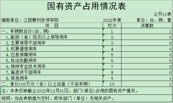 截止2022年12月31日,本单位国有资产占用情况见公开10表《国有资产占用情况表》。其中车辆中的其他用车主要是2005年购置的载货汽车(含自卸汽车),本单位已实行公车改革,所有车辆均已统一移交,该车因固定资产处置手续未办理齐全,故财务暂未下账,实际已不在学院使用。