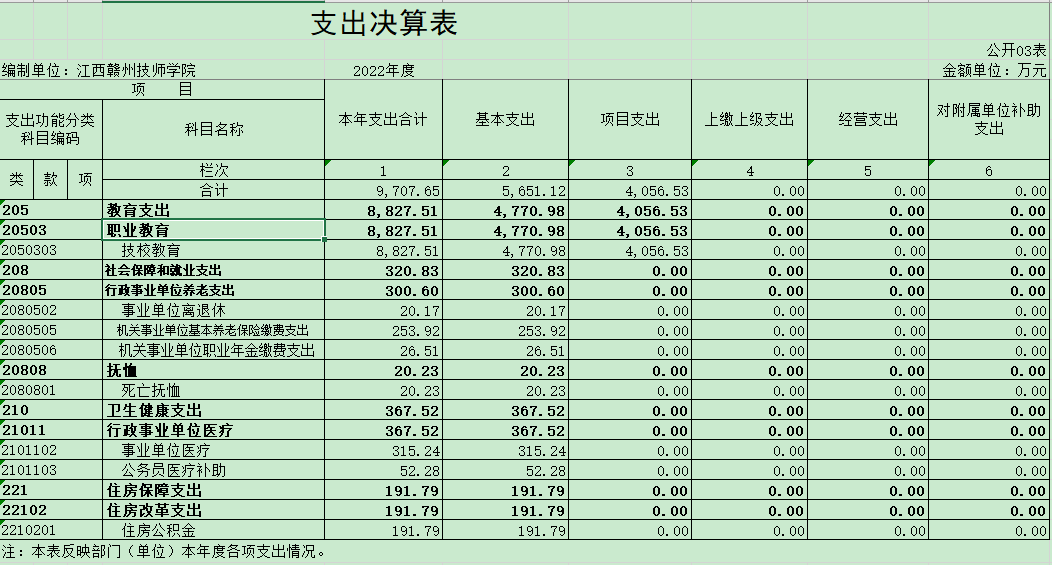 本单位2022年度支出总计9707.65万元,其中本年支出合计9707.65万元,较2021年增加1016.6万元,增长11.7%,主要原因是:根据学院统筹规划,现代职业教育质量提升计划专项资金年度内完成安排使用1388.94万元;年末结转和结余0万元,较2021年增加0万元,增长0%,主要原因是:年末无结转结余是单位执行财政零基预算政策。