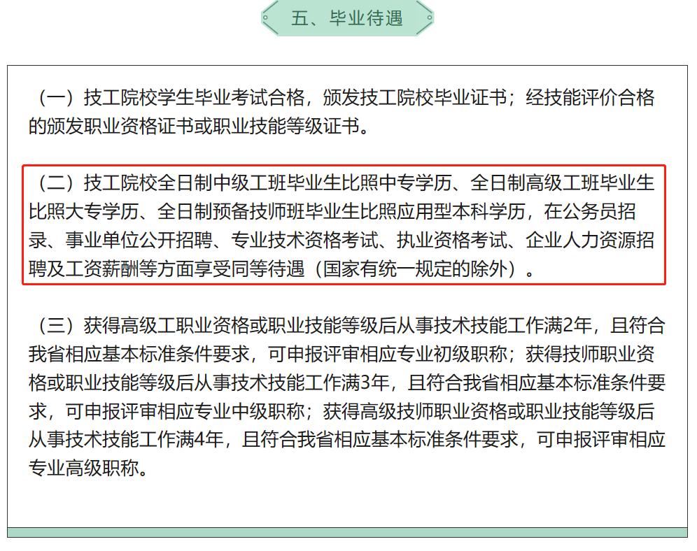 技工院校全日制高级工班毕业生比照大专学历、全日制预备技师班毕业生比照应用型本科学历,在公务员招录、事业单位公开招聘、专业技术资格考试、执业资格考试、企业人力资源招聘及工资薪酬等方面享受同等待遇。有关资讯可参考下面链接及图片: