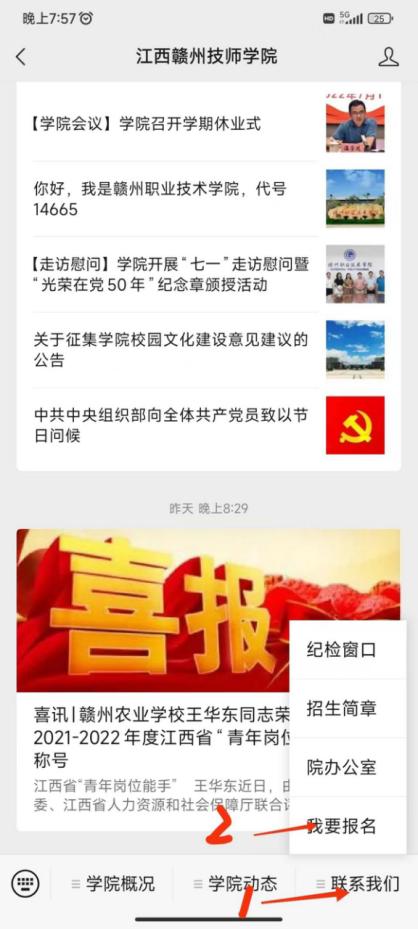 关注“江西赣州技师学院”官方微信公众号,从公众号的入口进入,如下图,点击:联系我们——我要报名