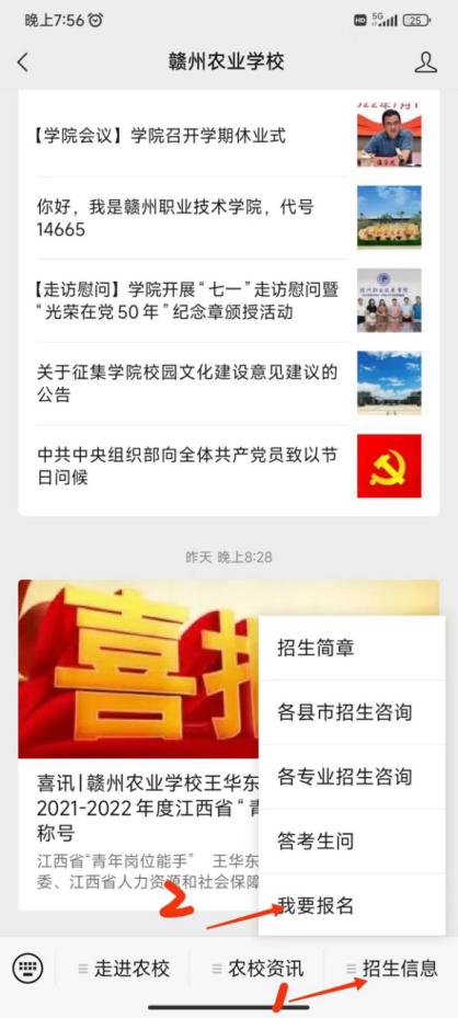 关注“赣州农业学校”官方微信公众号,从公众号的入口进入,如下图,点击:招生信息——我要报名