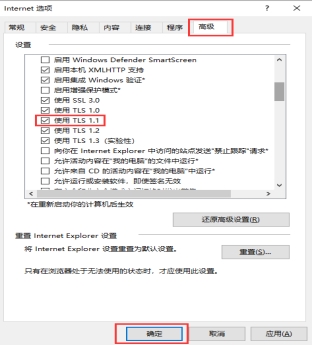 3.如不能正常访问,请清理浏览器缓存,检查浏览器“Internet选项”配置,确保勾选“使用TLS 1.0”,建议同时勾选“使用TLS 2.0”、“使用TLS 3.0”和“使用SSL 3.0”(如下图所示)。