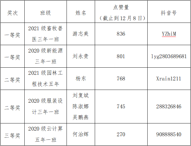根据《关于开展第二届“赣职杯”抖音短视频大赛的通知》要求,经各部门推荐及组委会评选,现将第二届“赣职杯”抖音短视频大赛获奖名单公示如下: