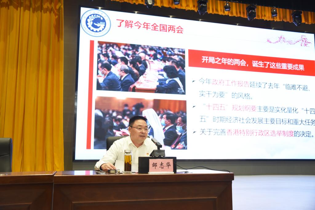 邹志华书记首先提到今年全国“两会”于3月5日召开,11日下午闭幕,共安排了3次全体会议。大会审议了10项议程,与以往相比,今年全国“两会”更具有特殊意义。此外,今年“两会”通过的“十四五”规划纲要,既是“国事”,也是“家事”。透过今年的全国“两会”,可以清晰的看到,新时代中国共产党人以百姓为中心,坚定不移的增进民生福祉,迈出了坚实有力的新步伐。