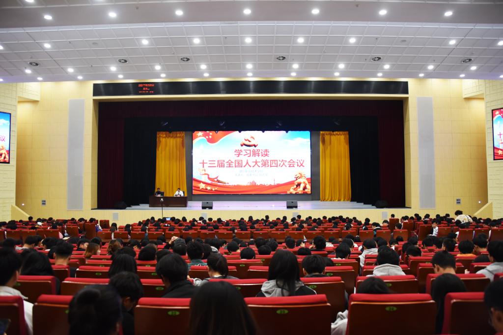 3月24日下午,党委书记邹志华给全校学生作形势与政策课专题讲座《学习解读十三届全国人民代表大会第四次会议》,专题讲座设主会场与分会场,以视频形式同步直播,教务处、马克思主义学院等相关部门负责同志,思政课老师代表和学院二千余名学生聆听了专题讲座,讲座由教务处处长杨孟鸿主持。