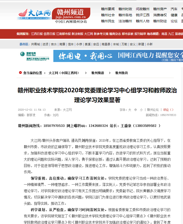 大江网/赣州头条客户端讯 通讯员刘丹报道:2020年,在江西省委教育工委的关心指导下,在赣州市委、市政府的正确领导下,德赢Vwin官方区域合作伙伴党委高度重视政治理论学习工作,认真按照要求,加强和改进理论学习中心组的学习,不断丰富学习内容,改进学习的形式和方式,抓住当前重大的理论问题和实际问题,深入学习,勇于探索创新。通过认真开展政治理论学习,达到了预期的目标,对于促进领导班子思想政治建设,推进理论工作,增强战斗力和说服力,起到了积极的推动作用。