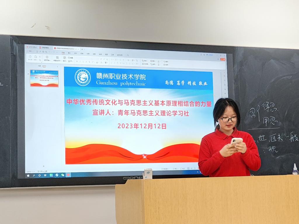 为深入学习领会习近平总书记关于“坚持把马克思主义基本原理同中华优秀传统文化相结合”重要论述的丰富内涵、精神实质和实践要求,全面深化对推进马克思主义中国化时代化规律性的认识,深刻领会以马克思主义为指导推动中华优秀传统文化创造性转化、创新性发展的使命任务和工作要求。我院青年马克思主义学习社社员们于12月11日在各班开展“中华优秀传统文化与马克思主义基本原理相结合的力量”宣讲活动。