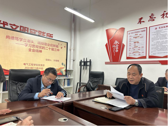 为深入学习贯彻党的二十届三中全会精神,近日,校领导叶晓明为电气工程学院教师作党的二十届三中全会精神专题宣讲暨上专题党课。此次宣讲会由学院党支部书记张俊华主持。
