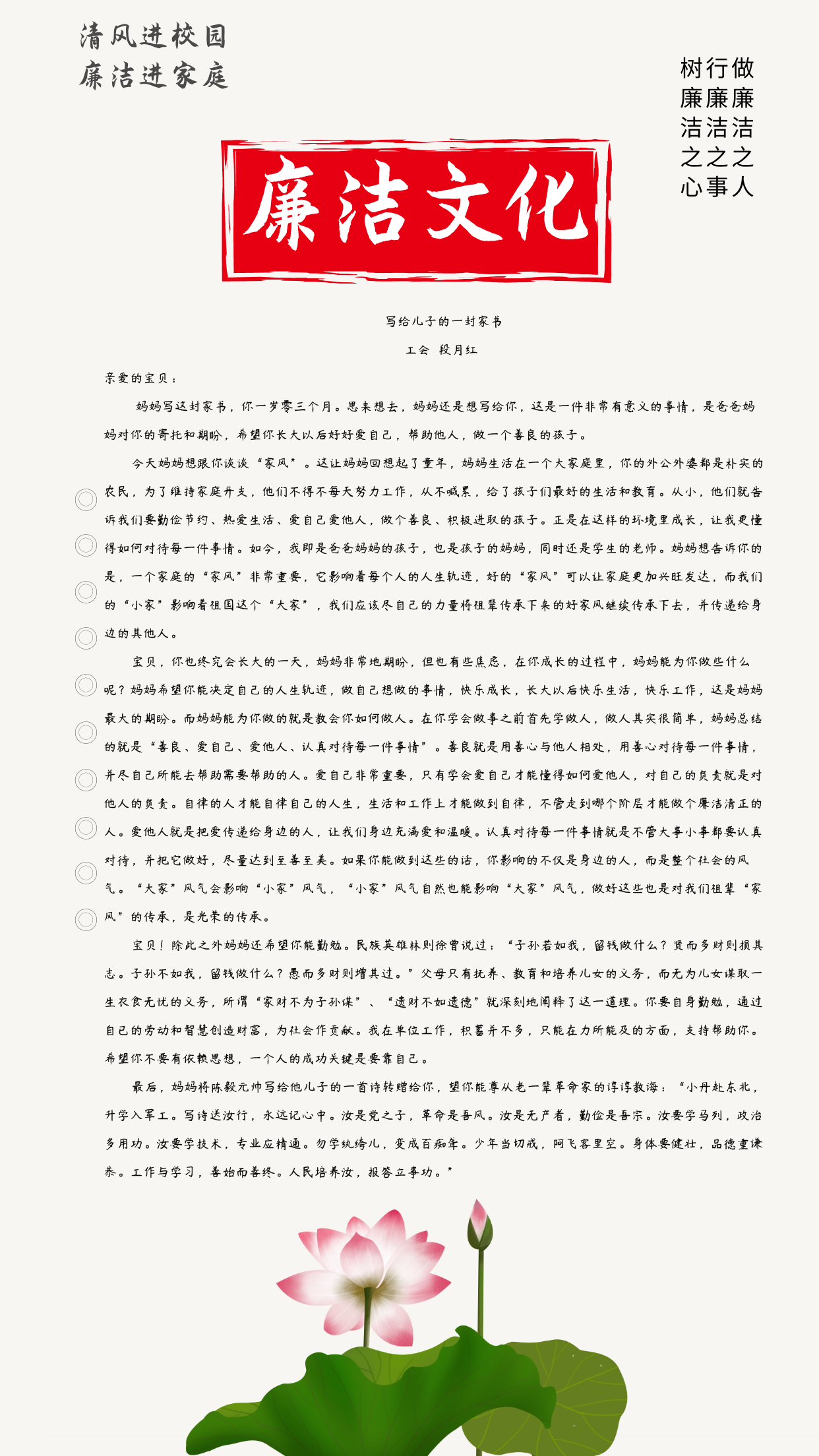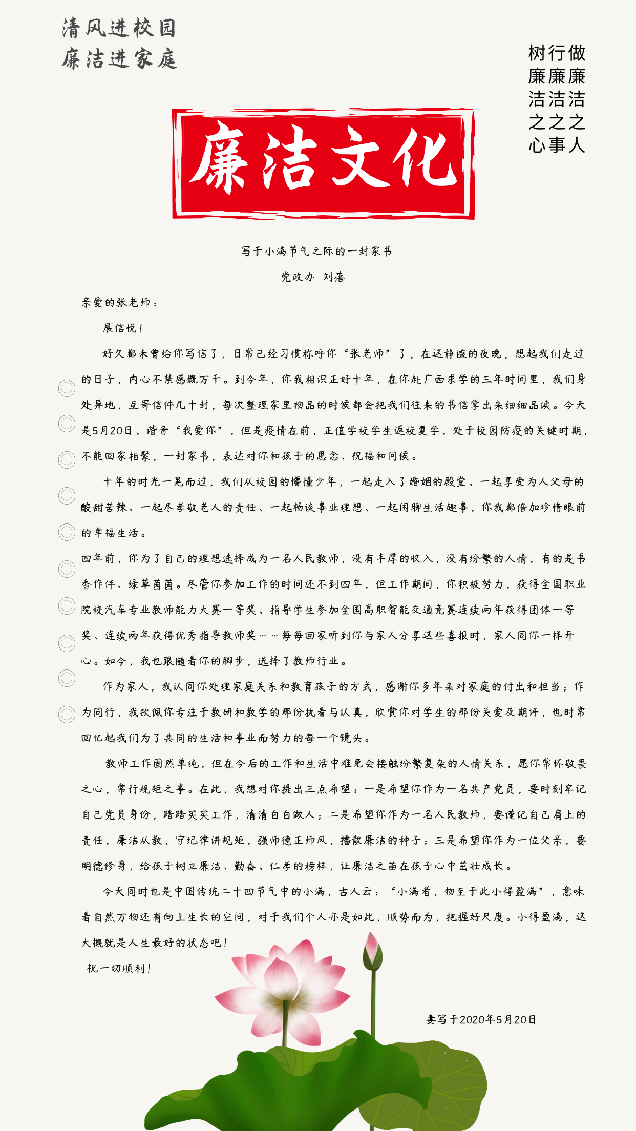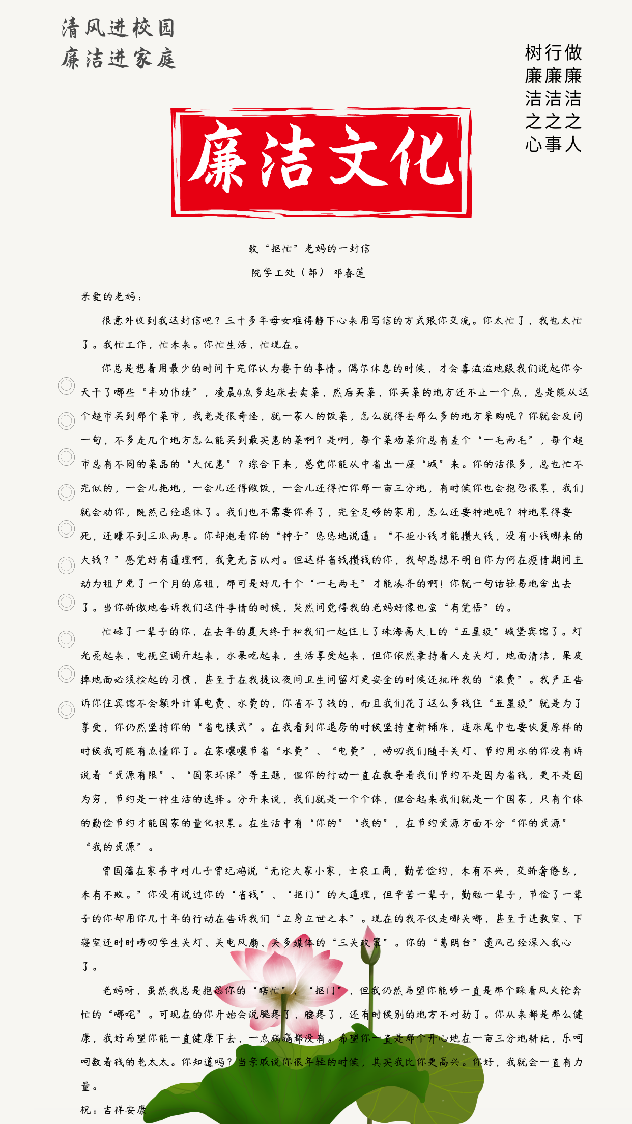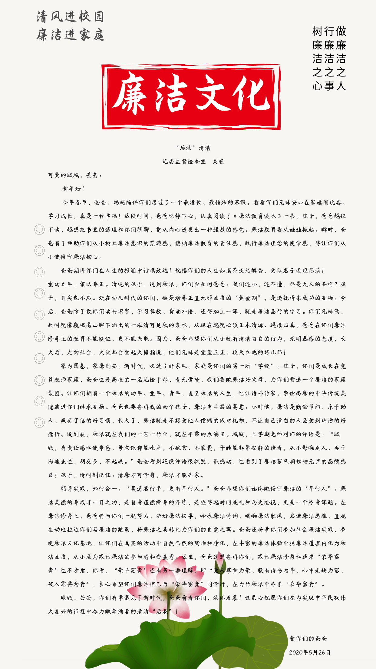 据市纪委《关于做好赣州市第九届“廉政文化月”活动的通知》要求,学院积极组织开展廉洁家书征集活动,共收到作品10篇,征集到的一封封廉洁家书情真意切,既提醒了身边亲人要远离腐败、保持廉洁,又表达了自身及其家庭成员对廉洁奉公、树好家风的感悟,也通过撰写廉洁家书的形式加强了与家人之间的情感交流。学院以此为契机,倡导全体教职工家属当好“廉内助”,把好家庭“廉政关”,为进一步达到廉政教育效果奠定了坚实基础。现将有关作品予以推送,请全体教职工予以重视与关注。