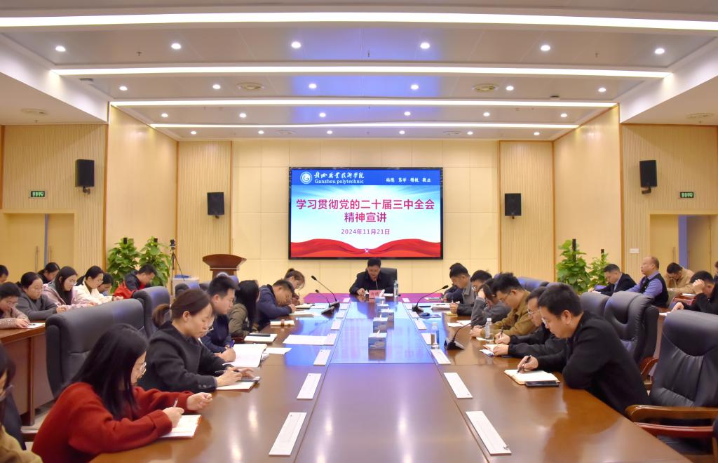 11月20日至21日,学校党委副书记汤晓军分别在现代服务学院党支部和机关党支部,就学习贯彻党的二十届三中全会精神进行了深入宣讲,支部全体党员参会。此次宣讲活动旨在引导广大党员深刻领会全会精神,推动全会精神在党支部落地生根,进一步坚定拥护“两个确立”,坚决做到“两个维护”。