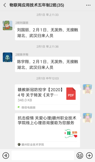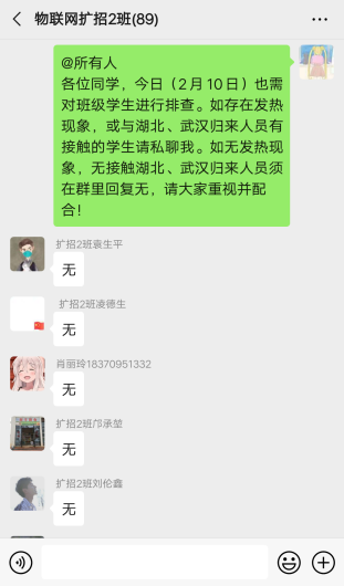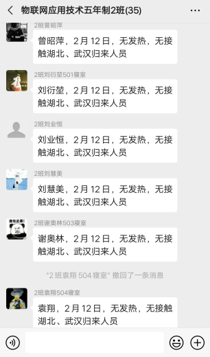 疫情发生后,各辅导员迅速联系本班学生,利用微信等网络平台构建起疫情防控实时监测台账,深入了解学生动态,实时监测学生健康情况,建立起学生、家长、学校三方互通的信息传递平台。及时调查记录班级内是否有疫区返赣人员,针对有特殊情况的学生,做到密切关注,每日问询。做实做细每日排查的情况上报,保证学生“零遗漏”。