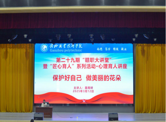 3月12日下午,第二十九期“赣职大讲堂”暨“匠心育人”心理育人讲座开讲。赣州市妇幼保健院行为科聂雨婷医生带来“保护好自己、做美丽的花朵”青春期健康教育主题分享。讲座由学生管理与就业服务处处长邱欣菊主持,主会场设在行知楼一楼学术报告厅,各班级设分会场,全体在校女生和辅导员、班主任参加。