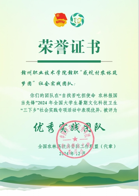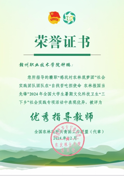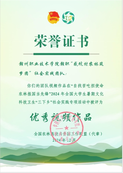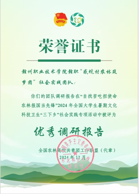 近日,由团中央青年发展部指导,团黑龙江省委学校部与全国农林高校共青团工作联盟主办、东北林业大学团委承办的“自找苦吃担使命 农林报国当先锋”2024年全国大学生暑期文化科技卫生“三下乡”社会实践专项活动圆满落幕。现代农林工程学院“感坑村农林筑梦团”在全国189支参赛队伍中表现优异,荣获优秀实践团队、优秀视频作品、优秀调研报告三项荣誉,团队指导教师钟鹏荣获“优秀指导教师”称号,是江西省唯一入围并获奖的团队。