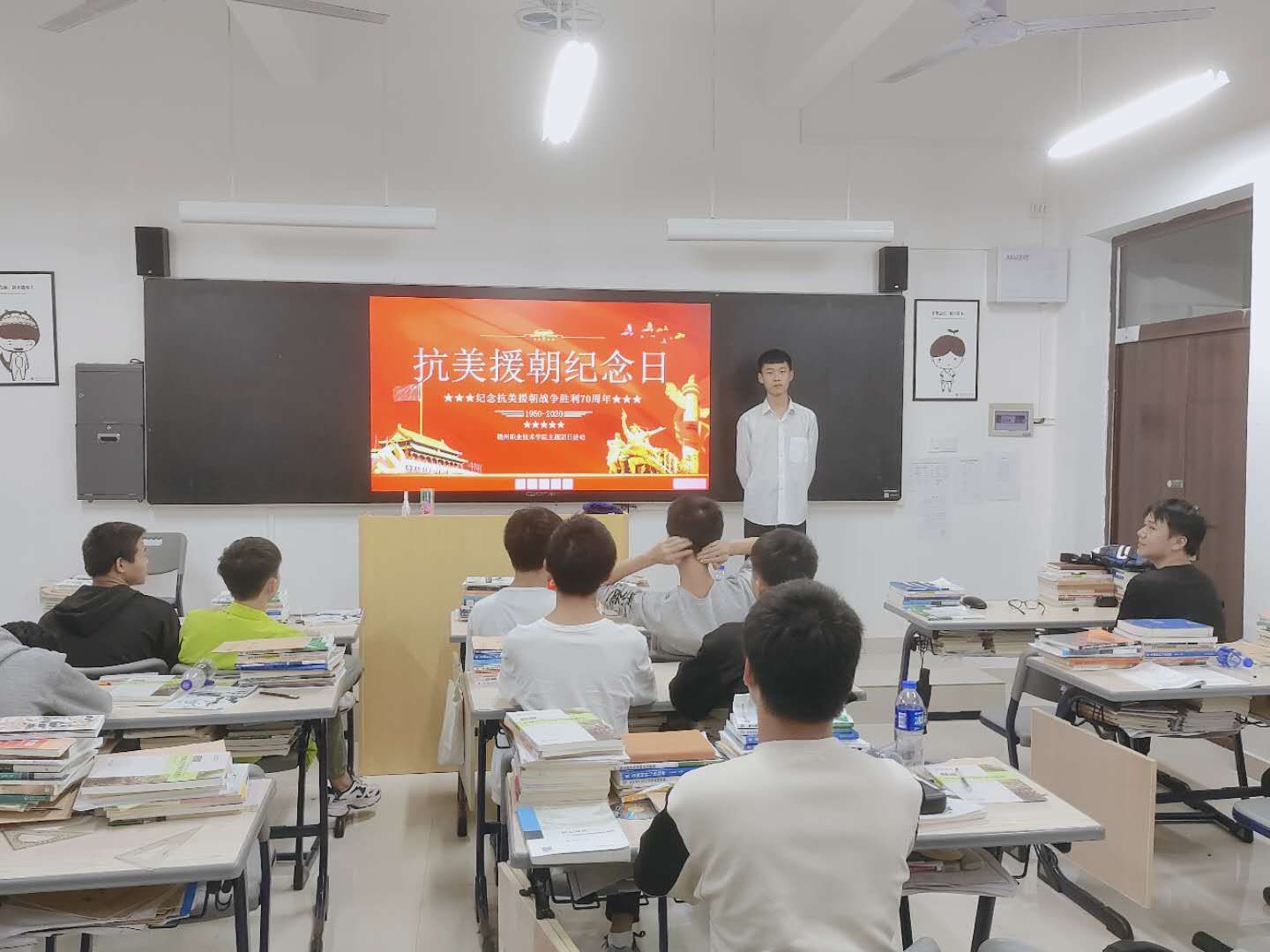 19级各班组织学习抗美援朝战争历史知识,观看纪录片,并发表感悟。19物联网三年二班谢富全说:“抗美援朝战争锻造形成的伟大抗美援朝精神,是弥足珍贵的精神财富,必将激励中国人民和中华民族克服一切艰难险阻、战胜一切强大敌人。”池燕燕说:“伟大的抗美援朝战争已经过去七十年,当前世界正经历百年未有之大变局,在这新时代的背景下,我们要继承和弘扬伟大抗美援朝精神,深入学习志愿军的英雄事迹和革命精神,牢记初心,不负使命,坚定必胜信念,为建设社会主义社会贡献力量。”本次活动,极大激发了同学们的爱国热情,为传承红色基因奠定基础。(初审:肖月;复审:曾卫平)