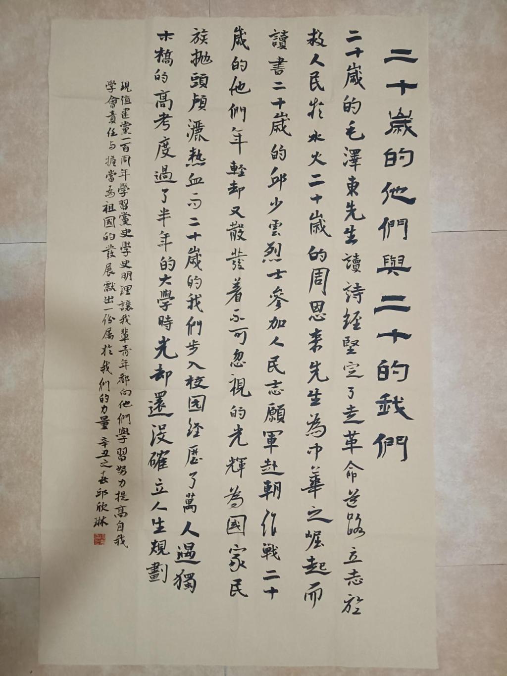 作品简介:整个作品的形式是以大中小字来突出对比的,由过去二十岁他们的事迹联系到现在我们的日常生活,来进行一个鲜明对比;他们二十岁的时候在为国家的建设做出了丰功伟绩,而二十岁的我们应该向他们看齐,珍惜现在的生活把自己的人生规划好,为祖国的建设献出一份属于我们的力量。现值建国一百周年,我们学习红色文化、学习党史、用书法艺术来记录史迹,用古典雅致的文字来激励青年一代的我们砥砺前行。