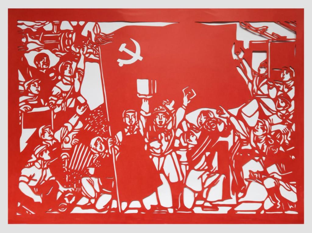 本作品运用刻刀刀尖刻画,刻画前先要打印底稿,运用红色的卡纸,然后根据画的内容一步步刻画,对于刻画人来说需要极大的耐心和毅力,主要考验我们的手尖力量,因为它的线条很细所以每一步都需要很小心刻画。我们用心雕刻,献给中国共产党建党100周年!