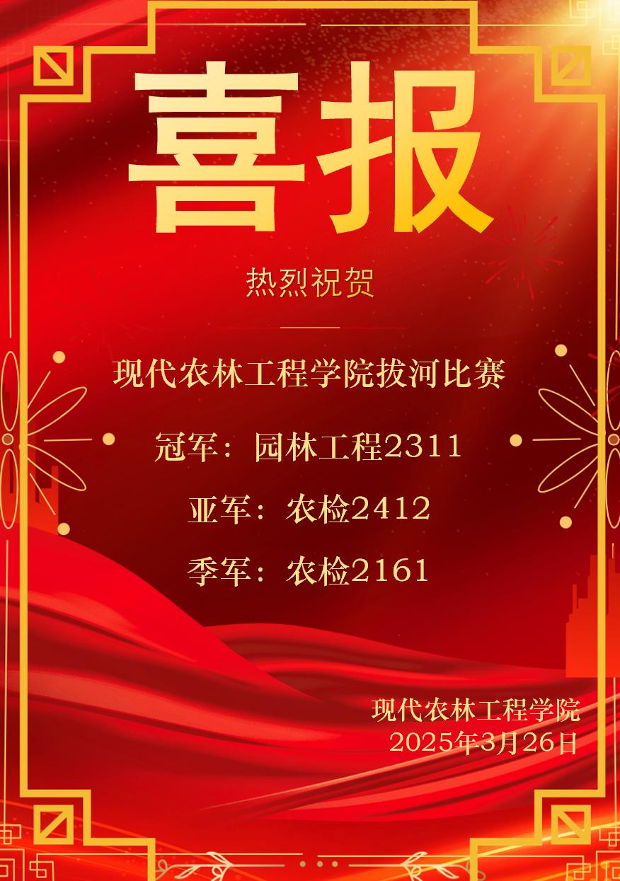 为丰富学生课余生活、强健体魄,增强班级凝聚力,加深各班级间的友谊,现代农林工程学院于3月26日开展了拔河比赛,现场热闹非凡,各个班级队伍都展现出了超强凝聚力和拼搏精神,为全院师生带来了一场精彩纷呈的体育狂欢盛宴。