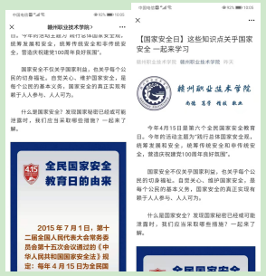 学院还组织平安江西志愿者国家安全知识专题宣传活动;组织观看央视、江西电视台播出的国家安全相关节目;组织观看千万师生同上一堂国家安全教育课;组织全体学生参加国家安全知识竞赛和趣味答题。通过上述活动的开展,师生积极联动,国家安全知识入脑入心。