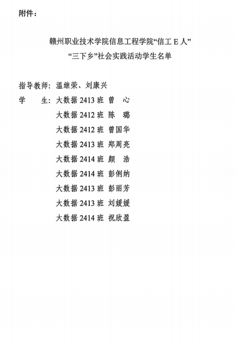据了解,“信工E人”团队此次“三下乡”活动由温继荣、刘康兴两位老师指导,成员包括大数据2413班曾心、郑周亮、彭丽芳、刘媛媛,大数据2412班陈璐、曾国华,大数据2414班颜浩、彭俐纳、祝欣盈等同学。他们用实际行动诠释了新时代青年与乡村发展同频共振的责任与担当。