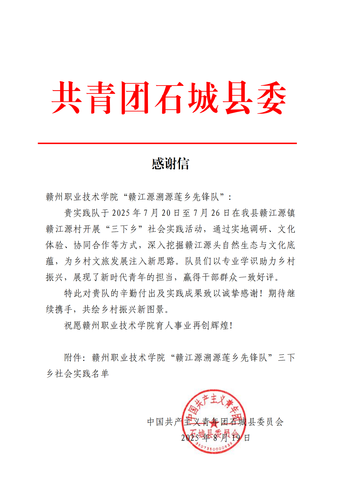 近日,学校“溯源莲乡”先锋队在石城县赣江源村开展的社会实践活动圆满落幕。在七天时光里,队员们带着青春的热忱与专业的知识,始终秉持着吃苦耐劳、求真务实的精神品质,在赣江源村的山水间田垄上留下了坚实的足迹,用实际行动诠释了新时代青年的担当,为此共青团石城县委向先锋队发来感谢信。信中衷心感谢学校的精心组织与大力支持,表扬队员们带来的三生理念为赣江源村注入了蓬勃的青春力量,提供了切实有效的服务与帮助,贡献了宝贵的青春智慧和专业力量。