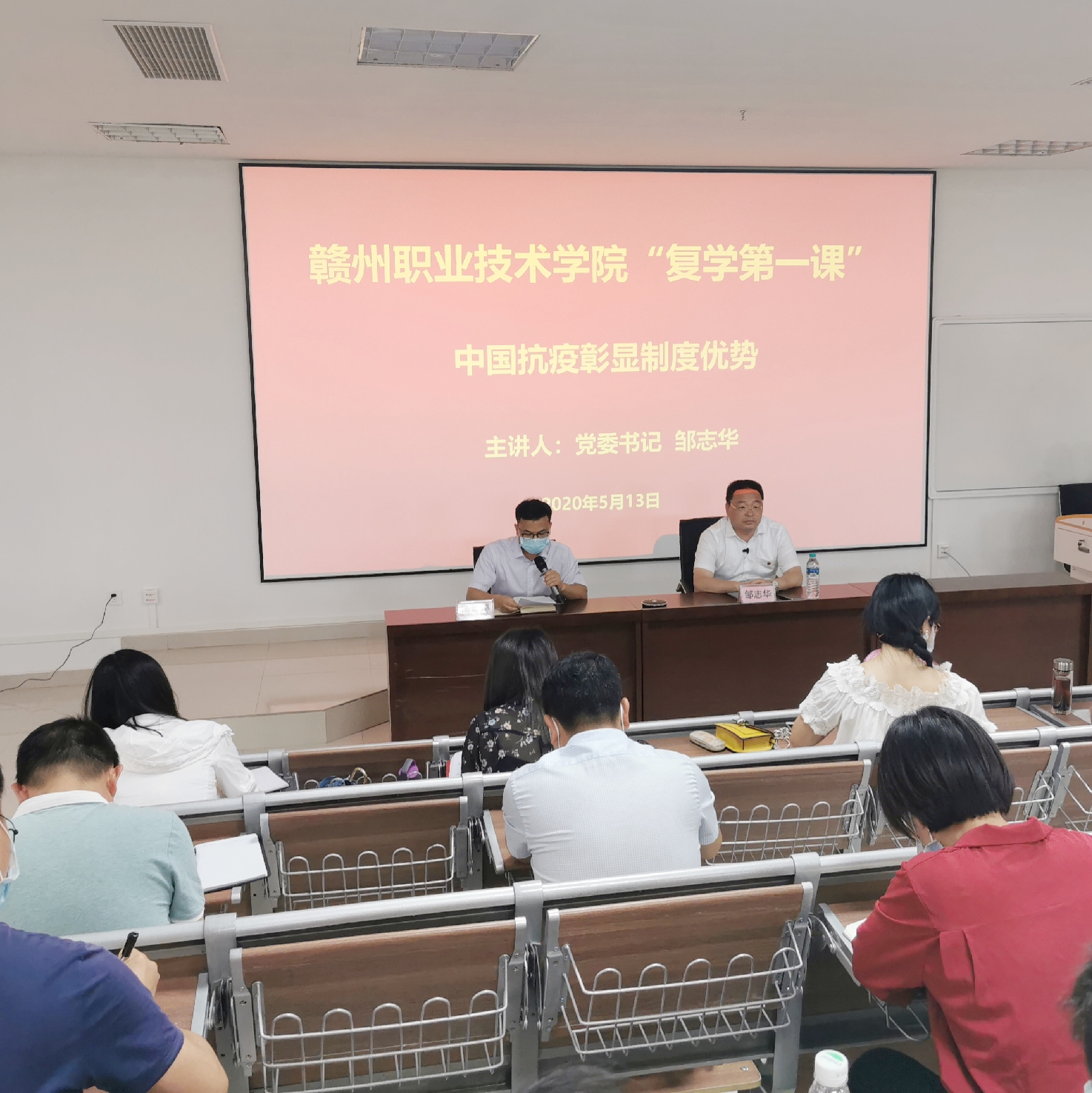 5月13日下午,德赢Vwin官方区域合作伙伴党委书记邹志华在阳明楼112阶梯教室为2019级学生讲授了“复学第一课”,教务处、学生工作处、马克思主义学院等部门负责人、全体思政教师、辅导员以及2019级学生共400余人听讲。