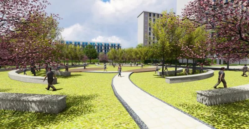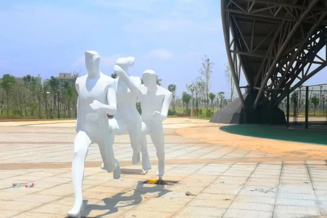 雕塑“奋进”便坐落在这风雨球场旁,它由三个你追我赶的青年形象组成,他们面朝学院行知大道方向,营造出学院积极向上、催人奋进的氛围。
