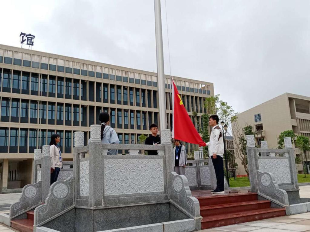 隆重的升旗仪式上师生共唱国歌,五星红旗冉冉升起,国歌声响彻整个校园。