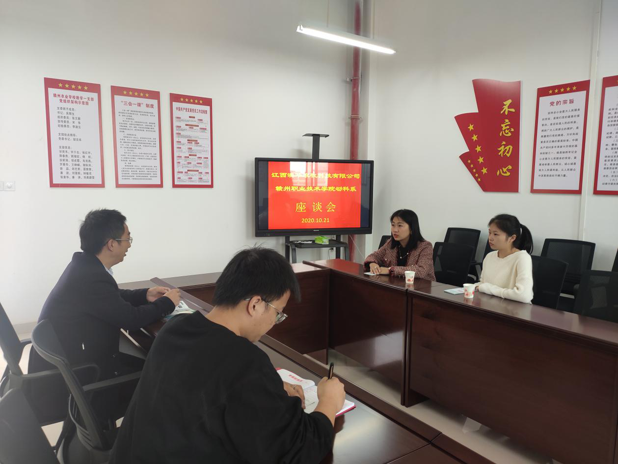 10月21日上午,江西澳华农牧科技有限公司人力资源部经理黄玉、人事专员朱钰嫔一行两人来校洽谈校企合作。动物科学系负责人吴辉生、畜牧兽医专业教师张乐红、吴庆鹏等参加了座谈会。