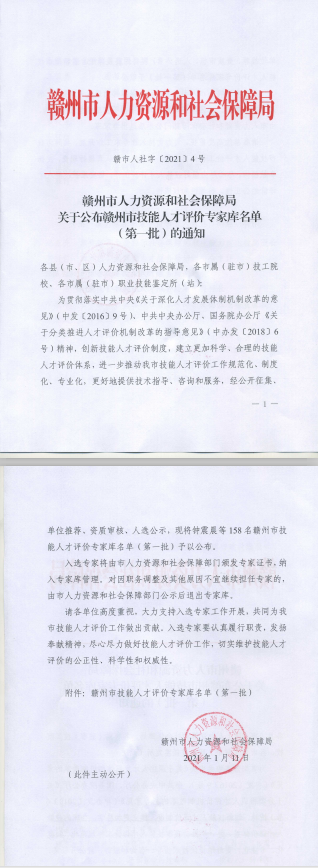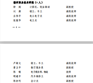 日前,赣州市人力资源和社会保障局发文,公布了赣州市技能人才专家库名单(第一批),我院钟闽、刘源、左伟平、张俊华、卢培文、曾卫平、陈曦、明建平、陈妍利等9名教师入选。