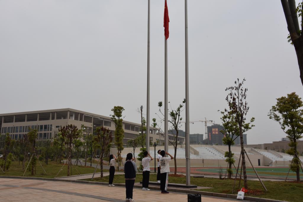本次升旗仪式分为升国旗、学生代表发言、教师发言三个环节。首先是升国旗奏国歌,准备就绪后,全场安静,国旗护卫队队员们迈着矫健的步伐护送鲜艳的五星红旗缓缓走来。当雄伟庄严的国歌奏响,五星红旗冉冉升起,迎风飘扬,全体师生心潮澎湃,并向国旗行注目礼。