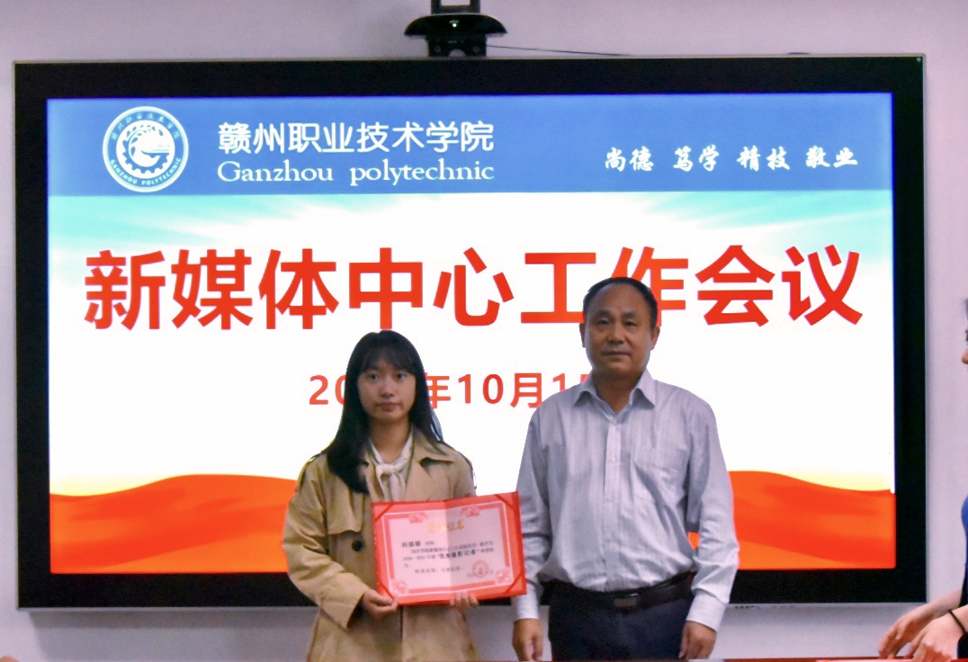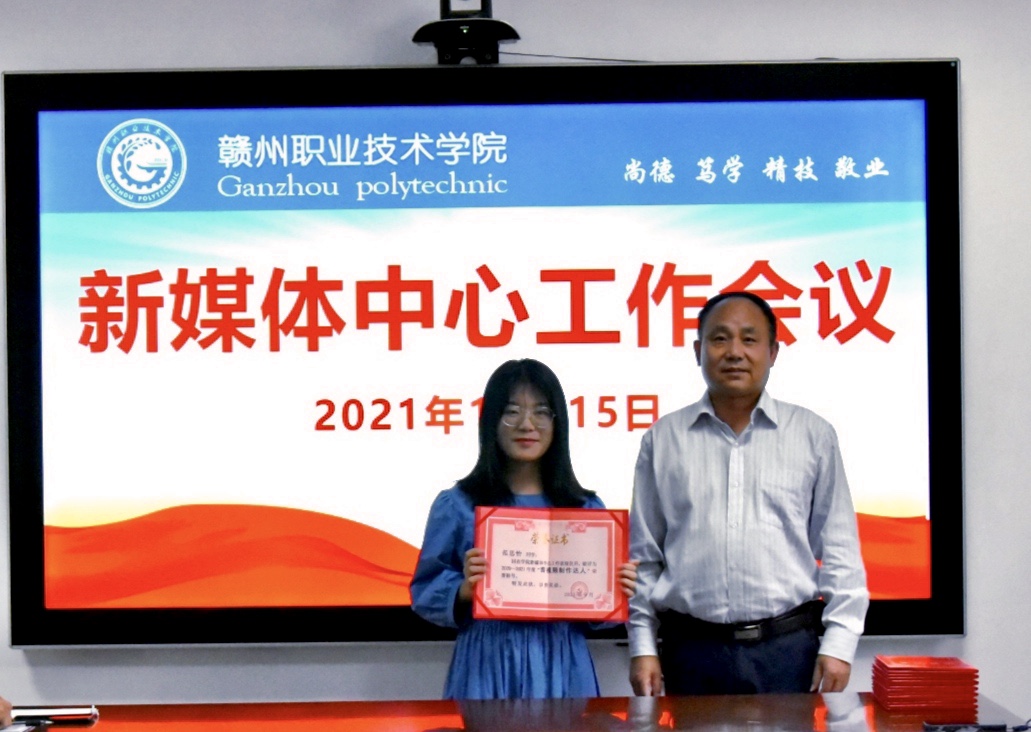 会上,通报表彰了学院2020——2021学年度新媒体中心工作先进个人,叶晓明为获奖学生颁奖。