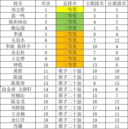 比赛分为自选歌曲演唱及红色歌曲演唱两个环节,共有20名选手站上了今晚决赛的舞台。