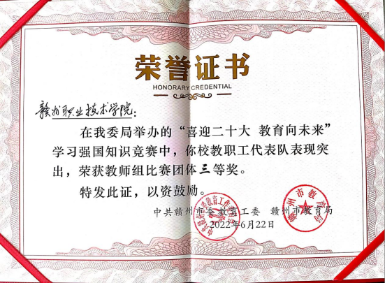 本次竞赛由赣州市委教育工委、赣州市教育局主办,赣南科技学院协办,共组建了9支队伍135名选手参加,竞赛采用手机微信扫码进行答题的方式进行,并分设团体奖和个人奖。我院共组织15名教师参加比赛,经过激烈的角逐,我院荣获团体总分三等奖,教师获个人一等奖一名、个人三等奖四名的好成绩。