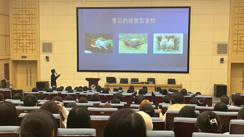 讲座中,袁柏琛同学用大家熟悉的“宠物(伴侣动物)”,向大家提出了什么是宠物的问题,引发了大家的思考,进一步引入了观赏动物和爬宠的概念,由浅入深地将同学们带进异宠的神秘世界。现场氛围异常高涨,同学们踊跃互动。