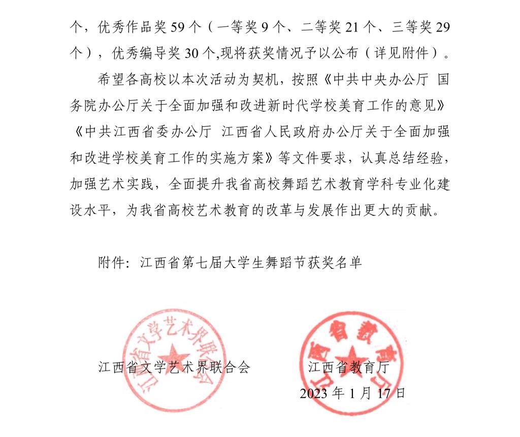 此次比赛共有41所高校参赛,我院群舞《禾下乘凉梦》在109件参赛作品中脱颖而出,充分展示了我院学子较强的专业技能和我院良好的教学成果,现代服务系师生将认真总结经验,加强专业实践,继续坚持“以赛促学、以赛促教、以赛促改”的方针路线,为我院高质量发展作出更大贡献。