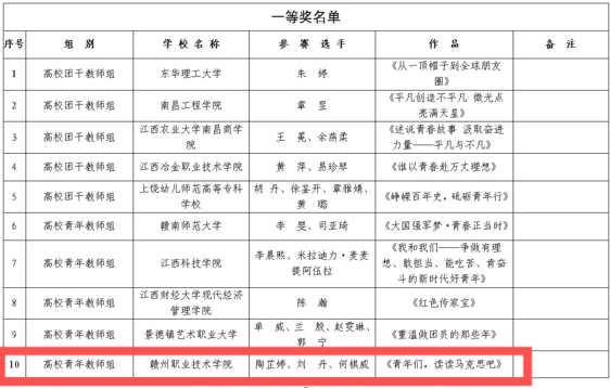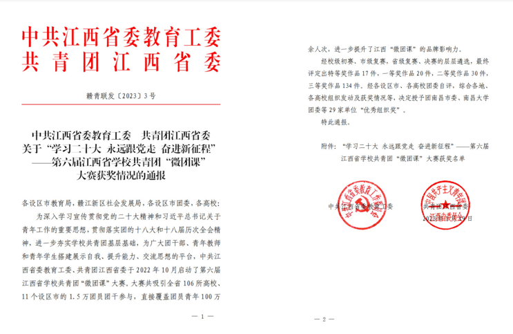 近日,2022年度江西省、赣州市学校共青团“微团课”大赛获奖名单揭晓,我院教师团队在大赛中获佳绩。