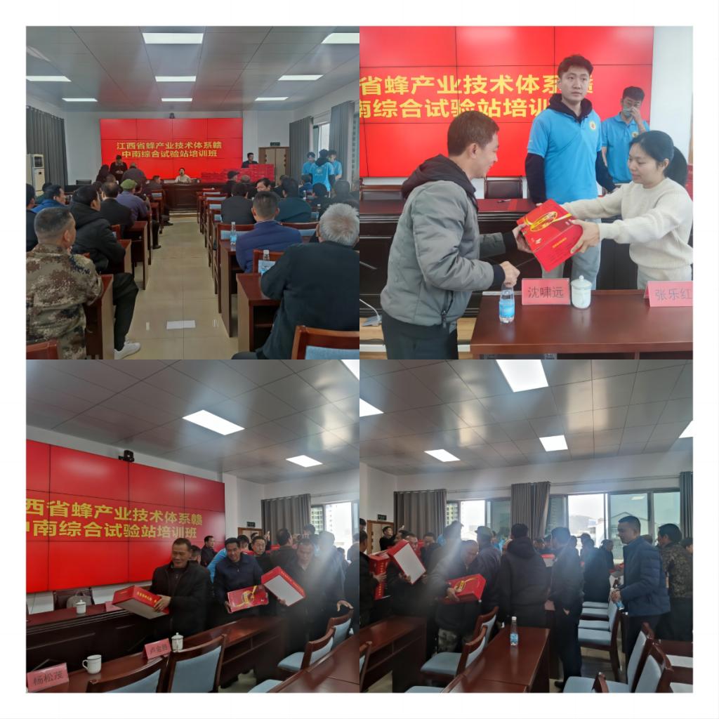 潘其忠老师做了以《蜜蜂的春繁技术》为主题的专题培训。培训会上蜂农们求知若渴,认真聆听。潘老师对蜂农现场提出的日常养蜂过程常见问题进行了细致解答。培训会场气氛活跃,蜂农们都表示受益匪浅。培训结束后,赣中南综合试验站为每个蜂农赠送了一箱巢础。